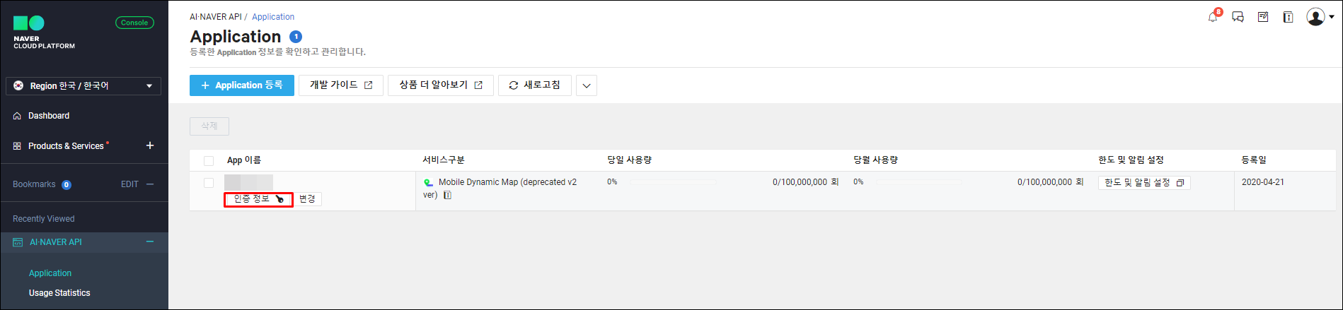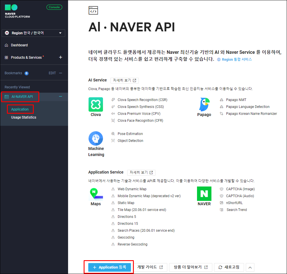 7. 콘솔로 이동이 되고 AI NAVER API 하단의 Application 메뉴를 선택합니다.