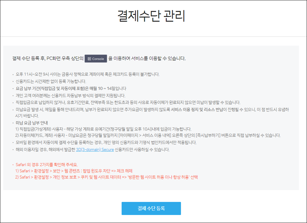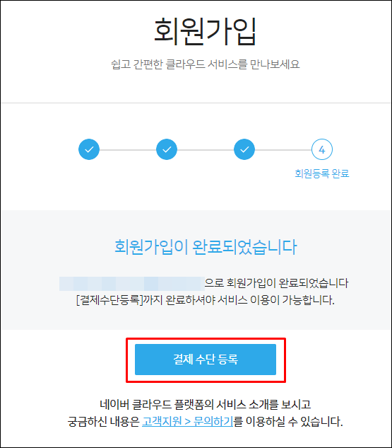 5. 회원가입 완료 후 하단에 있는 결제 수단 등록을 선택합니다. 네이버 지도 같은 경우 무료로 이용을 할수 있지만 결제 수단을 등록하지 않으면 네이버 API를 사용할 수 없으므로 결제 수단을 등록합니다.