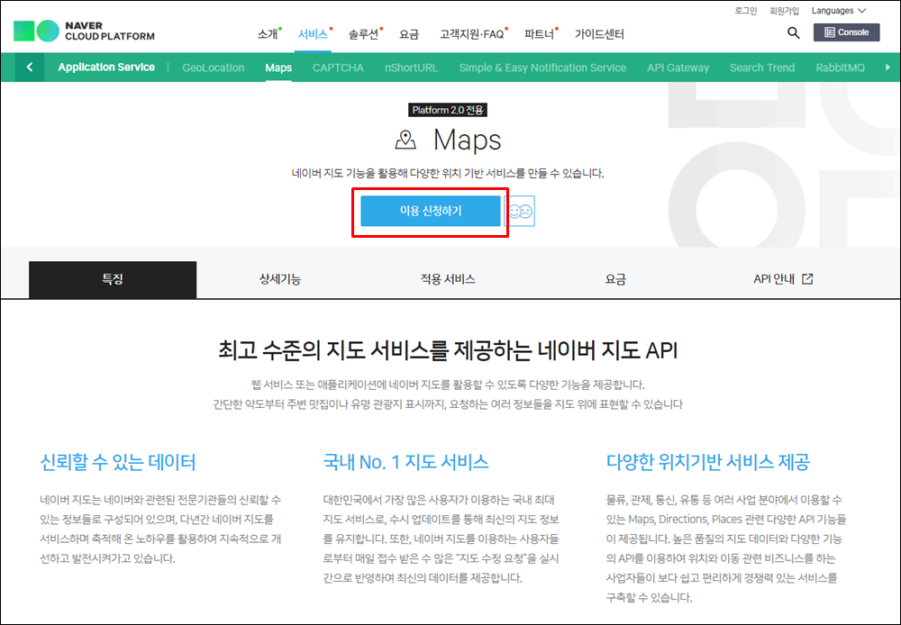 2. 상단 메뉴 중 서비스 -> Application Service의 Maps를 선택합니다.